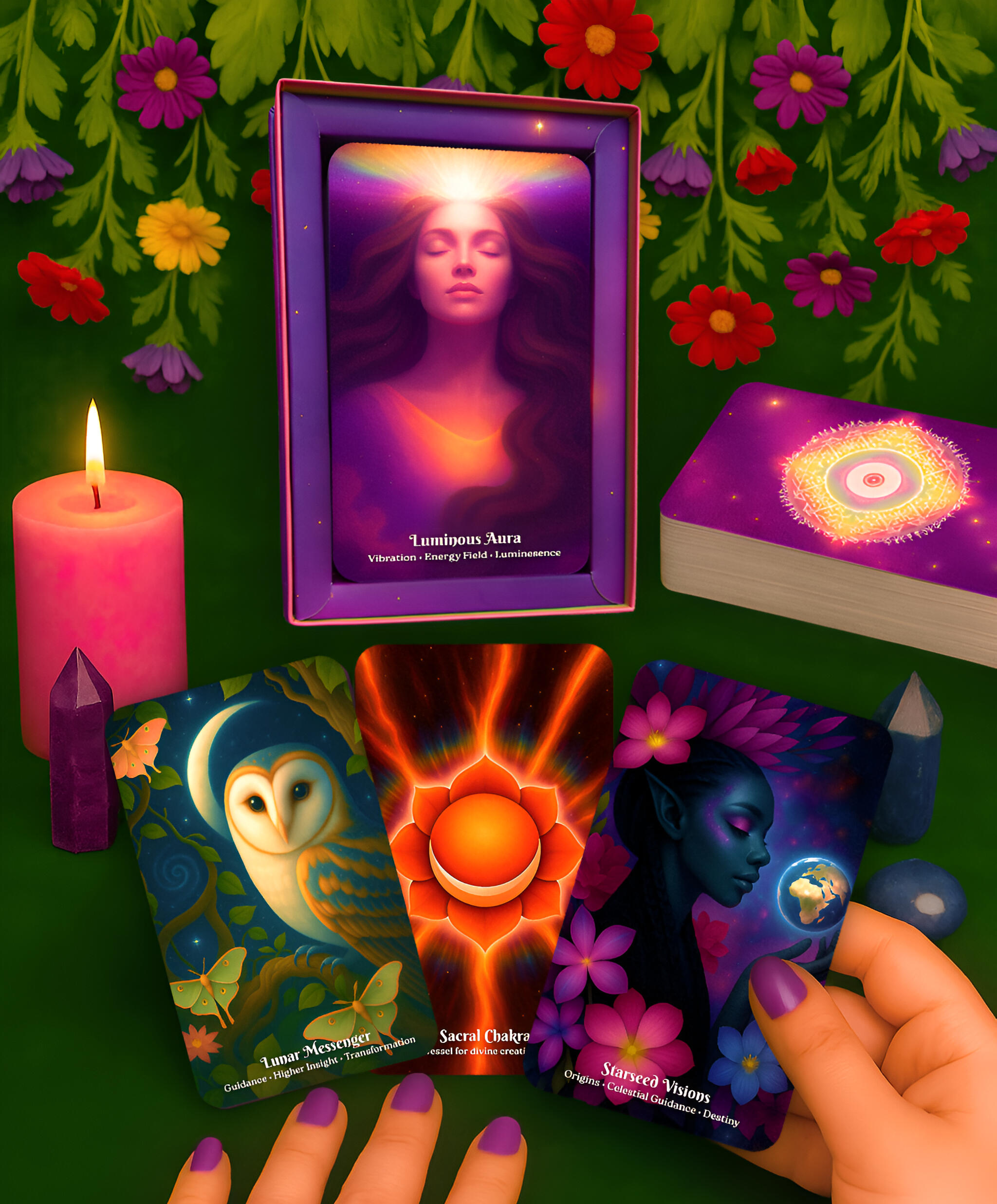 I am currently creating three decks: Age of Aquarius Psychic Cards, Dreamer's Way Tarot & Aetheric Dimensions Portal Cards!Follow along on Instagram!